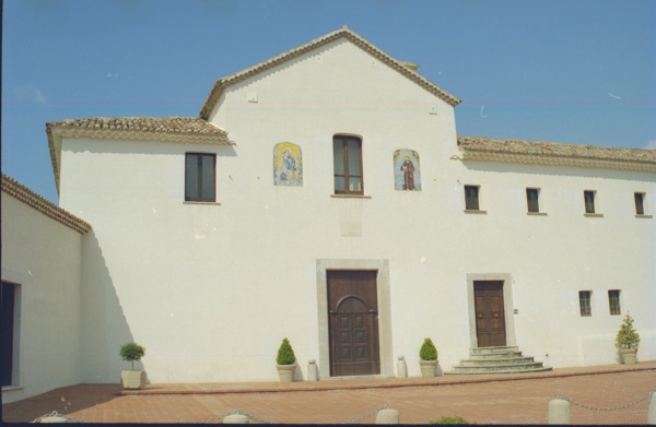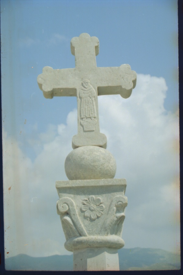 È annessa (fig. 9) l’antica Chiesa di S. Francesco (1652-53), che mostra sul piazzale antistante (fig. 10) una Croce francescana, che riporta sulle due facce le immagini di S. Francesco e di Cristo Crocifisso. Sull’altare maggiore, in marmi policromi a tarsia (come gli altri altari) è sistemato un curioso polittico, assemblato nel Settecento, accostando tre tele montate su un binario per coprire un armadio portareliquie. I dipinti laterali raffigurano Santi e Sante (S. Michele, Angelo custode, S.Ludovico e S. Bonaventura) di Rinaldo Fiammingo, mentre quello centrale (fig. 11) una Deposizione di Antonio Stabile (?)