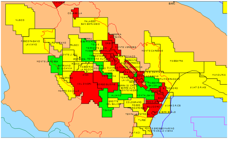 Quando si parla di Val d’Agri si fa riferimento a una quindicina di permessi di ricerca e a sei concessioni di coltivazione (vedi documento a margine) Le concessioni che interessano l’alta montagna sono soprattutto quelli di Caldarosa e Costa Molina (decreto ministeriale del 27/10/1998) e quella del Volturino (decreto ministerile del 23/12/1993) nel programma TREND 1.