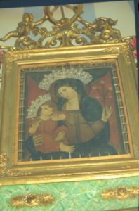 in una nuvola posta tra Dio e la Vergine c’è il Gesù Bambino, mentre da una finestra s’intravede il paesaggio del monte Vulture; sotto al centro c’è lo stemma della chiesa di S. Nicola e a sinistra la figura del committente, il parroco di rito greco-albanese.