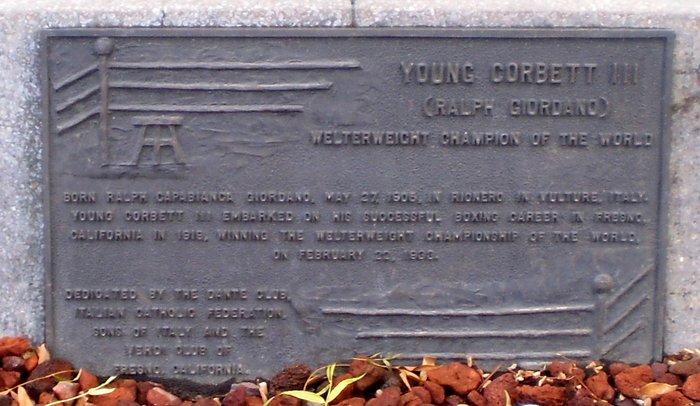 Il lucano aspettava quel giorno; da troppo tempo l’avevano tenuto lontano dal titolo mondiale. Eppure aveva battuto tutti, compreso gli ultimi campioni dei welter. Ma era tenuto in disparte da anni; troppo pericoloso, un mancino velocissimo e poi troppo italiano dallo zio manager allo sparring il cugino Al Manfredo. Tutti lucani, tutti provenienti da Rionero, Monticchio, Avigliano.Era un giorno del 1933, probabilmente Raffaele Giordano prima dell’importante incontro che lo attendeva, si rilassava con il suo hobby preferito coltivare la vite nelle fertili terre di California, come facevano i suoi antenati nella lontana Lucania, pensava alla sua carriera di pugile. Nonostante i suoi 28 anni, era un veterano: aveva sostenuto già 130 incontri, da quanto appena quattordicenne salì la prima volta sul ring; era un peso piuma; lo speaker lo annuncio come Ralf Giordano, la lo slang californiano non era adatto usciva un pessimo suono; e poi era un “dago” il nomignolo intriso di razzismo con il quale si chiamavano gli americani. Così scelse un nome irlandese come facevano tanti boxer del bel paese per favorire la carriera come fece Ugo Miceli che diventò Hugo Kelly un re del ko,oppure il formidabile piuma siciliano Giuseppe Corrora diviene Johnny Dundee, addirittura l’altro lucano Giuseppe Di Melfi divenne Young Zulu Kid. Il giovane Giordano scelse Young Corbett III, a prendere l’eredità di quel straordinario campione dei piuma che fu William Rothwell,un duro e selvaggio uomo del west conosciuto come Young Corbett II. In 14 anni di combattimenti Young Corbett III aveva affrontato tutti i migliori pugili, dai pesi piuma ai welter, rare sconfitte accompagnate da chiarissime vittorie, grazie alla sua velocità e tecnica; un guardia destra dalla boxe spumeggiante, ma fu anche il suo dramma: vinceva ed era talmente forte che faceva il vuoto attorno a sé, ed i campioni mondiali evitavano di difendere la corna contro il terribile mancino lucano. Ma ripercorriamo la vita di Raffaele Giordano, nato a Rionero in Vulture il 27 maggio 1905.