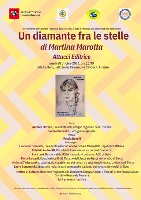 Ne parlano, lunedì 28 ottobre alle 16,30, medici specialisti provenienti da Siena e Firenze e Prato Farà da filo conduttore, al convegno sulle malattie rare polmonari, il libro Un Diamante fra le stelle di Martina Marotta, poetessa e scrittrice lucana, edito dalla Attucci Editrice di Carmignano. Saranno presenti il Prof. Luca Luzzi, chirurgo, specialista in trapianti polmonari dell’Università di Siena, membro del centro di coordinamento per le malattie rare polmonari, La professoressa Elena Bargagli, docente presso l’università di Siena e Coordinatrice Unità Malattie Rare dell’apparato respiratorio AOU di Siena, le ricercatrici Miriana D'alessandro e Laura Bergantini, dell’Università di Siena anch’esse presso il centro di coordinamenti delle malattie rare polmonari, il Dott. Matteo Di Stefano Referente Regionale Toscana per la Croce Rossa Italiana per la Donazione di Sangue, Organi e Tessuti. Si parlerà di malattie definite rare perché colpiscono realmente poche persone e per tal motivo sono più difficili da studiare e curare ma si parlerà anche di trapianti polmonari e di donazione organi. Il convegno è legato al libro di Martina Marotta, un libro che contiene una silloge di poesie, alcuni brani in prosa ma anche oltre 50 scatti in alta risoluzione di fotografie naturalistiche. Da quasi due anni la madre di Martina, Antonella, è deceduta a causa di una di queste terribili malattie e Martina, che già in passato aveva pubblicato altri libri, ha deciso di aiutare la ricerca con la cosa che sa fare di più: scrivere. Il libro e queste manifestazioni hanno il patrocinio onorario della Associazione Nazionale Alfieri della Repubblica Italiana e della International Universum Academy Switzerland di Lugano. Non è la prima volta che Martina mette a disposizione la sua arte per aiutare chi ha bisogno. Con il primo libro, L’arcobaleno della IIIA, sostenne le attività dell’AIL di Prato e di Potenza, con il secondo libro, Io Spero che …, ha sostenuto le attività della sede pratese della Croce Rossa Italiana, di cui è volontaria da oltre un decennio. Nel corso del convegno saranno recitate alcune poesie di Martina da poeti ed attori che hanno dato la loro disponibilità: Pina Petracca e Rodolfo Vettor.