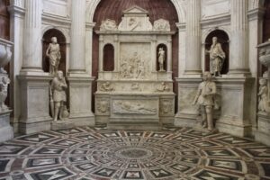 Spostandoci in Puglia, a Lecce il Vescovo Carafa nel 1763 fece demolire l’antico monastero delle Paolotte edificando l’attuale palazzo in stile barocco. Sulla facciata compare ancora oggi lo stemma della famiglia Carafa, mentre sui battenti del portale,ben visibili, i simboli araldici dei conti normanni che dominarono la città tra XI e XII secolo. Spostandoci leggermente più a nord la città di Martina Franca vanta il Palazzo Ducale fatto erigere proprio dai Caracciolo al posto del vecchio castello Aragonese. Il complesso è dotato di splendide stanze affrescate e di tele raffiguranti i ritratti dei potenti signori della città itriana e un grande atrio interno dove annualmente si svolge il Festival della Valle d’Itria. Nel Palazzo oggi si conserva l’antico archivio storico denominato, appunto, “Archivio Caracciolo-De Sangro”. L’altro importante archivio delle famiglie di nostro interesse è invece conservato, come per altri, presso l’Archivio di Stato di Napoli (Archivio Caracciolo di Melissano e di Scanno). Questo articolo, come ho già detto, non contempla come si dovrebbe l’eredità artistica e architettonica dei Caracciolo-Carafa, perché hanno lasciato la loro “firma” ovunque abbiano amministrato. In fin dei conti basta cercarli.