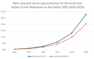 Il Politecnico di Milano ha esaminato l’impatto del metaverso sul PIL italiano in una ricerca commissionata da Meta dal titolo “Assessing the economic value of immersive technologies in Italy” (tratto da Osservatorio Metaverso).