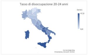 Fig.2 Tasso di disoccupazione per fascia d’età 20-24 anni. Elaborazione dati ISTAT 2019 (ultimo anno disponibile)