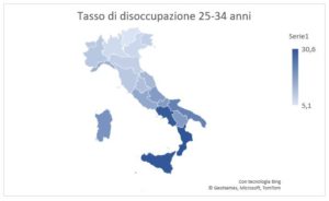 Fig.3 Tasso di disoccupazione per fascia d’età 25-34 anni. Elaborazione dati ISTAT 2019 (ultimo anno disponibile)