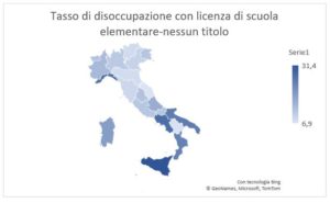 Fig.4 Tasso di disoccupazione per forza lavoro con licenza elementare o nessun titolo. Elaborazione dati ISTAT 2019 (ultimo anno disponibile).