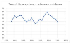 Fig.8 Serie storica tasso di disoccupazione per forza lavoro con laurea/post laurea. Elaborazione dati ISTAT.