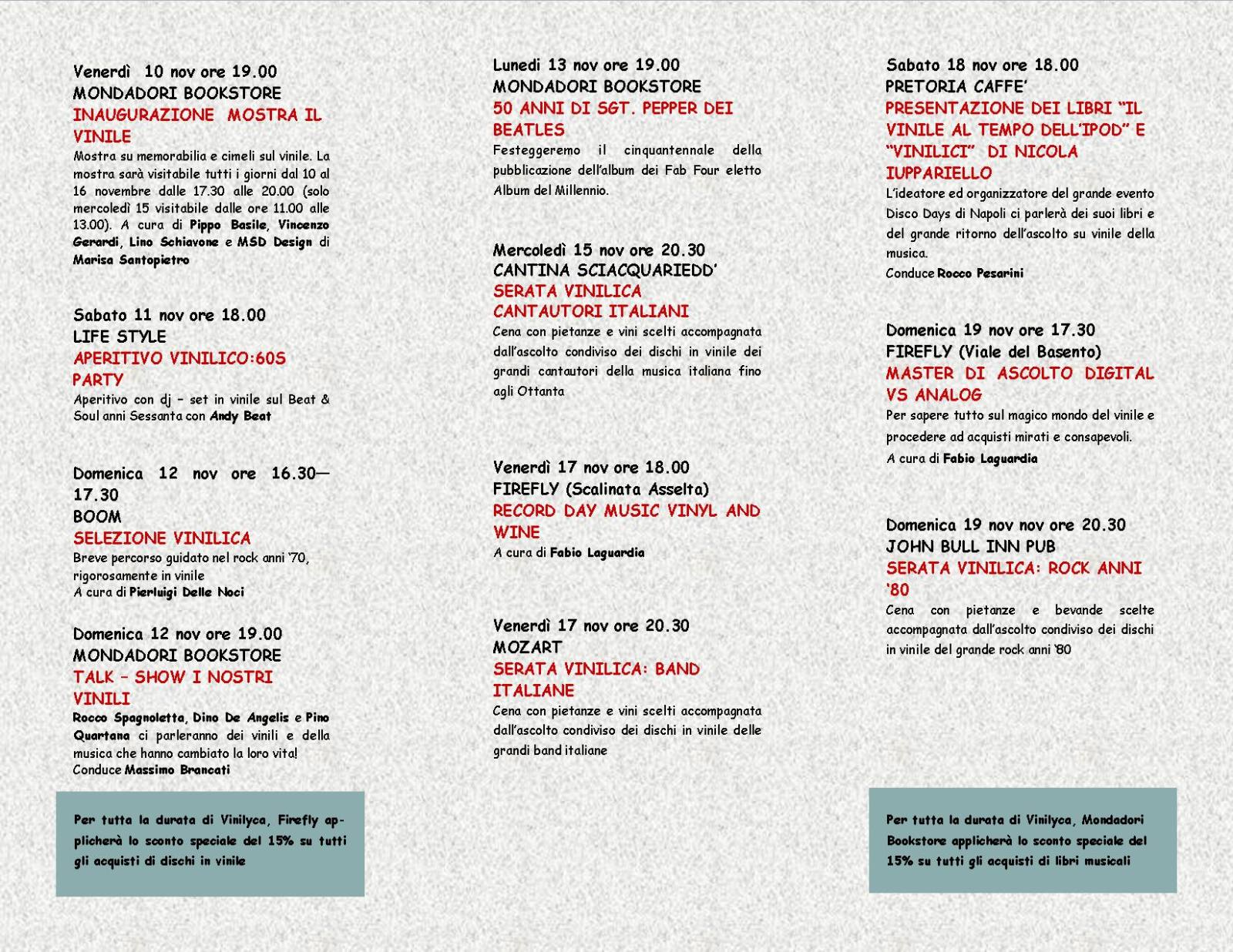 Ore 19.00 – Mondadori Bookstore – VINILYCA 2017: I NOSTRI VINILI – Talk – show condotto da Massimo Brancati con Dino De Angelis, Pino Quartana e Rocco Spagnoletta che ci parleranno della musica (e dei vinili) che ha cambiato la loro vita. Nel cartellone di Vinilyca 2017 di SonoricaMente