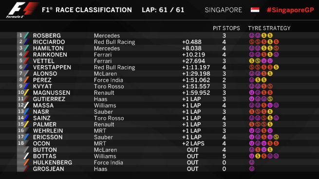 Nico Rosberg torna leader del mondiale. Anche Singapore è una gara targata Mercedes. Nulla ha potuto Daniel Ricciardo, che ha provato a giocare il jolly della strategia diversa pur di raggiungere il pilota tedesco. Gran rimonta per Vettel: l’alfiere della Ferrari è riuscito a concludere al 5° posto dopo essere partito dal fondo della griglia. Il gradino più basso del podio è andato a Hamilton dopo una gara in lotta con l’altra Ferrari, quella di Raikkonen.