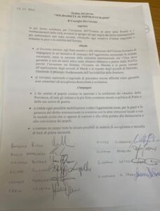 • a creare ogni possibile mobilitazione contro l’aggressione russa, per la pace e la garanzia del diritto internazionale in concorso con le altre istituzioni locali e con la società civile che si oppone al sopruso e alla sfida portata alla democrazia e alla convivenza dei popoli;