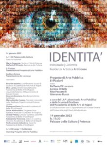 “Identità individuale | Collettiva” a cura del LAP Laboratorio Arte Pubblica e della Scuola di Scultura dell’Accademia di Belle Arti di Napoli, è parte del progetto di Residenza Artistica Art House, promossa delle società Bweb e BroxLab, con il patrocinio del Ministero della Cultura, della Regione Basilicata, del Comune di Potenza e con il patrocinio morale del Museo Nazionale di Matera e della Direzione Regionale dei Musei della Basilicata, con i partenariati della Scuola di Scultura dell’Accademia di Belle Arti di Napoli, del Dipartimento di Scienze Umane dell’Università della Basilicata e del Liceo W. Gropius. (L.C.)