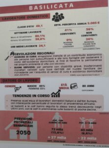 In Basilicata sono impegnate annualmente oltre 20.000 badanti straniere in maggioranza in nero quindi senza assicurazione con salari attorno ad una media di 700 euro. Nello stesso comparto lavorano anche le donne lucane anch’esse prevalentemente in nero. Gli ultimi dati Istat, ed una ricerca di Domina e della Fondazione Leone Moressa, dicono che nel 2019 in Basilicata erano regolari ed assicurati 3. 115 persone, il 52% stranieri e il 47,4 italiani. A questi lavoratrici si sono aggiunti nel 2020, per la sanatoria ,849 unità.
