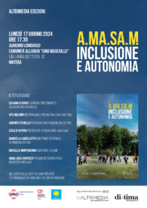 Sarà presentato oggi lunedì 17 giugno alle 17.30 nel giardino condiviso della Comunità Alloggio “Gino Masciullo”, in via Laura Battista 12 a Matera, A.Ma.Sa.M. Inclusione e autonomia (Altrimedia Edizioni) curato dalla giornalista e scrittrice Rossella Montemurro. Sono previsti gli interventi del coordinatore della Comunità Alloggio “Gino Masciullo” Luciano Bitondo, del responsabile psichiatria D.S.M. Vito Incampo, della psicologa con funzione educatrice Samanta Fusiello, del presidente A.Ma.Sa.M. Lucia D’Antona, della direttrice editoriale di Altrimedia Edizioni Gabriella Lanzillotta, della curatrice del volume Rossella Montemurro e del presidente Cooperativa Progetto Popolare Anna Lucia Contuzzi. Nel corso della serata sono previste le testimonianze di familiari e volontari dell’A.Ma.Sa.M. I ventisette anni dell’Associazione Materana per la Salute Mentale ­– che, parafrasando il titolo, nell’ottica dell’inclusione e dell’autonomia sostiene persone con problematiche psichiche o psicologiche ­– sono racchiusi in questo volume alternando le testimonianze dei ragazzi a quelle dei volontari e dei familiari. “L’anima dell’A.Ma.Sa.M. è data tutt’oggi dalla cospicua presenza di volontari che, insieme a qualche familiare, danno continuità e garanzia di realizzazione di progetti per l’intero anno. Attualmente ce ne sono molti rivolti ai soli ragazzi, altri a ragazzi, familiari e volontari e uno, annuale, rivolto a familiari e volontari affinché possano formarsi e operare nel miglior modo possibile”, sottolinea Lucia D’Antona, presidente pro tempore dal 2018. Quello delle malattie mentali è ancora oggi uno stigma ingombrante e fastidioso. Parlare di malattia non è mai semplice, in particolare quando si affrontano argomenti che riguardano la psiche, condizionati come siamo da paure e pregiudizi. Con questa pubblicazione l’A.Ma.Sa.M. intende lanciare un messaggio forte per superare i preconcetti. “Tante storie, tanti vissuti, un unico filo conduttore che li accomuna tutti. Il senso di smarrimento di fronte a un proprio congiunto affetto da una malattia mentale, il pellegrinaggio tra vari specialisti, la diagnosi, la terapia e il rendersi conto del modo, talvolta ostile, comunque poco inclusivo, in cui la società è disposta ad accogliere persone con problematiche simili. Tra familiari è importante fare rete: accorgendosi di avere un problema che interessa anche altre persone, si riesce ad affrontarlo da un’altra prospettiva, probabilmente meno cupa e, insieme, si cercano soluzioni”.  Rossella Montemurro, giornalista professionista materana. Laureata in Scienze dell’educazione, ha lavorato per “Il Quotidiano della Basilicata” – occupandosi dei settori “Cronaca” e “Cultura” –, “Il Mattino di Foggia”, “Il Mattino di Puglia e Basilicata”, il “Roma” e con la testata giornalistica online IlmioTg. Ha collaborato con l’emittente televisiva “Antenna Sud”. Attualmente dirige la testata giornalistica online TuttoH24 (www.tuttoh24.info). Collabora con l’agenzia di comunicazione DiotimaHa pubblicato per Ediesse Edizioni nel 2004 I giorni di Scanzano (segnalazione della Giuria del Premio letterario Basilicata, 2005); per BMG Editrice nel 2010 Carabinieri a Matera. Tradizione e modernità al servizio dei cittadini, pubblicazione autorizzata dal Comando Generale dell’Arma dei Carabinieri; per Altrimedia Edizioni nel 2019 Calci e pugni sul tetto del mondo. Biagio Tralli, identikit di un campione; nel 2020 sempre per Altrimedia Edizioni Il mio tuffo nei sogni. Marco D’Aniello, una storia di sport e amicizia (insignito a settembre 2022 in Campidoglio del riconoscimento “Roma premia la Cultura sociale”); nel 2023 Galoppando contro vento. I Western Haflinger di Emanuele Lamacchia (Altrimedia Edizioni).
