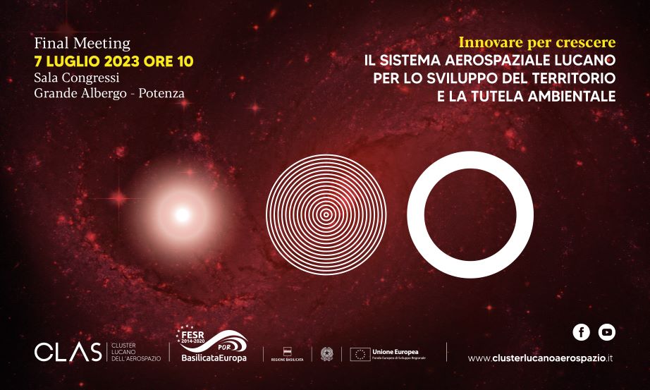 Il prossimo 7 luglio, alle ore 10:00, presso la sala congressi del Grande Albergo di Potenza (Corso XVIII Agosto, 46), avrà luogo il Final Meeting del CLAS dal titolo “Innovare per crescere – Il Sistema Aerospaziale Lucano per lo sviluppo del territorio e la tutela ambientale”.
