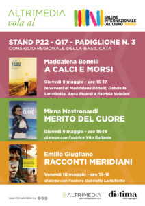Tra gli incontri previsti con gli autori di Altrimedia, giovedì 9 maggio alle 16 Maddalena Bonelli presenterà A calci e morsi. Dialogherà con l’autrice la direttrice editoriale di Altrimedia Edizioni, Gabriella Lanzillotta, insieme ad Anna Picardi e Patrizia Valpiani. Ambientato tra gli anni ’30 e ’40 a Grassano, A calci e morsi (terzo posto nel Concorso Artistico Letterario “Impavidarte–La biennale della cultura 2022/2023”) è un romanzo corale sull’umanità di gente umile che si misura con gli alti e bassi dell’esistenza e fa fronte, come può, a tragedie improvvise. Tra i protagonisti, Cenzino e Rocco, amici fin da piccoli; Ciccillo innamorato di Lucietta, per sposarla deve rinunciare alla sua famiglia; suo fratello Pasquale che sceglie di andare a combattere. Per loro la strada è stata maestra di vita, poi la vita ha presentato il conto tradendo i loro sogni. Maddalena, invece, è andata avanti tra figli, aborti e la durezza di una quotidianità pesante, un destino per niente clemente e i lutti portati dalla guerra. Sempre il 9 maggio alle 18 sarà la volta di Merito del cuore di Mirna Mastronardi. Interverrà con l’Autrice l’editore Vito Epifania. Merito del cuore è l’autobiografia di Mirna Mastronardi, la fondatrice di Agata, la prima organizzazione di volontariato oncologico della Basilicata. Con coraggio, Mirna racconta la sua adolescenza in un piccolo paese del Materano, la famiglia, gli amici, le riunioni del PCI, i tanti lavori, gli attacchi di panico e una passione fortissima per un uomo che le spezzerà il cuore ma le lascerà un dono inestimabile: Dea. Da qui, la rinascita di Mirna, quella che lei definisce “la sua seconda vita” nella quale però è messa a dura prova per la malattia della sua più cara amica, Lucia, e quasi in contemporanea per la scoperta devastante di avere un tumore. Venerdì 10 maggio, infine, alle 15 sarà presentato Racconti meridiani di Emilio Giugliano. Con lui dialogherà la direttrice editoriale Lanzillotta. Giugliano opera da oltre 20 anni nel volontariato internazionale e ha maturato esperienze di cooperazione in Africa e in America Latina. Questi racconti, memorie di vicende vissute tra il 1999 e il 2007, sono il frutto letterario degli eventi esaltanti, drammatici e curiosi vissuti dall’Autore in quelle terre lontane. Racconti Meridiani inaugura ALTER, la nuova collana di Altrimedia Edizioni. Alter significa ospitalità, incontrarsi con altri sguardi e altre culture, per leggersi negli occhi, accogliere, dialogare ad altezza d’anima e comprendere orizzonti nuovi. L’identità si crea a partire da un viaggio, fuori di sé, per valorizzare spazi di diversità e chiamare ricchezza tutto ciò che può apparire “altro” rispetto al pregiudizio e all’immaginario comune. E ritrovarsi più maturi al ritorno. Il tema della XXXVI edizione del Salone del Libro è Vita immaginaria, quel territorio sorprendente e misterioso che dà vita a un patrimonio di infinite possibilità. Il tema dell’edizione diventa in questo senso un archivio, ma anche una mappa possibile del futuro. Questa edizione sarà un omaggio alla vita immaginaria che muove la vita creativa, in tutte le sue forme: al suo modo geniale, malinconico, fiducioso e sempre nuovo di creare altri mondi e di farli incontrare, sperando perfino che qualcuno di essi possa diventare reale.