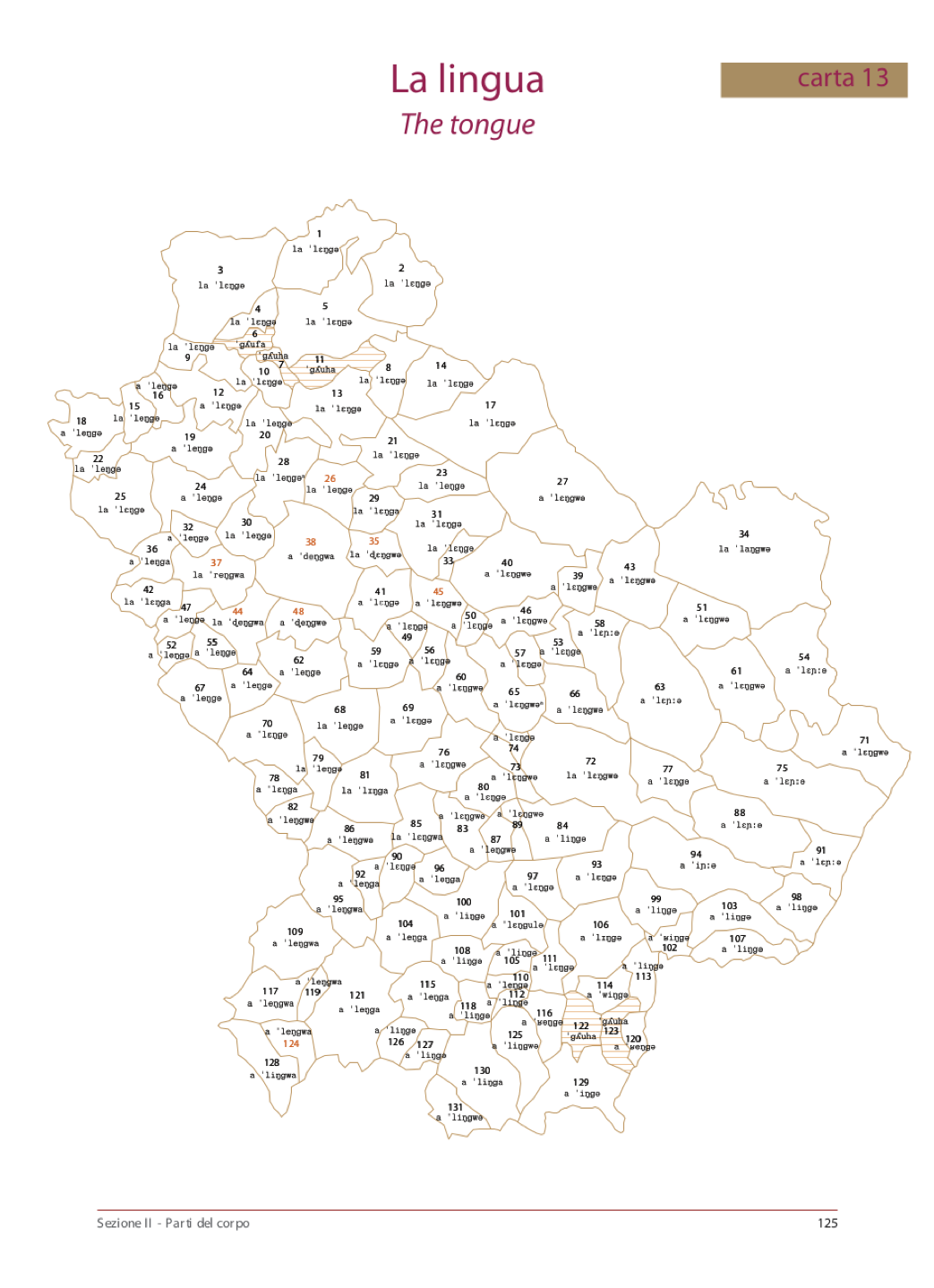 In relazione a questa carta le colonie galloitaliche di Albano di Lucania (pdr 45), Pietragalla (pdr 26) Trecchina (pdr 124) non registrano l’esito atteso in dentale /d/ ma la conservazione della laterale /l/ etimologica: léngua [ˈleɳgwa] ‘lingua’.