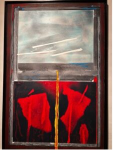 Ed è carta, carta da cucina, quella assorbente che usiamo tutti i giorni, su cui si raggrumano rossi e neri, macchie, colori che tutti insieme si dispongono quasi a comporre una croce. Certo, ce la suggerisce l’artista nel suo racconto ma non è un suggerimento banale o ruffiano, per nulla, è il lucidissimo ulteriore, finale, colpo di pennello che ci schiude la mente verso una rappresentazione ancora più dolente perché fatta di povera materia di tutti i giorni. Col nero e il rosso che ci schiudono la semantica del cromatismo usato e la complessità che si cela dietro quel che ci appare davanti.