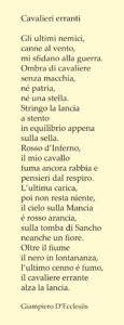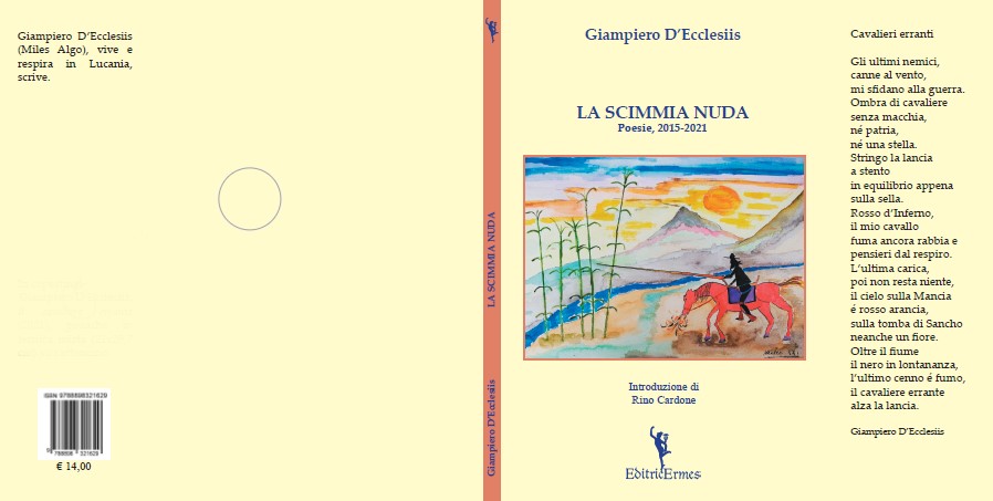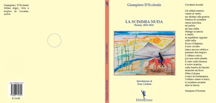 Quel libro voleva scriverlo da anni, ma parliamo di poesia, di creatività e non si può comandare alla creatività di uscire dal cilindro così e neanche a un libro di uscire magicamente dalla tipografia. Fare un libro è facile, ci vuole poco. Invece scrivere un libro è difficile, innanzitutto ci deve essere qualcosa da dire, da esporre, da condividere. Poi se è narrativa, anche l’estro, l’originalità. Se si tratta di poesia, il tutto si complica poiché “fare poesia” è difficile, sempre più difficile. Giampiero D’Ecclesiis nonostante si definisca un grafomane ha impiegato il giusto tempo per dare alla luce la sua silloge “La scimmia nuda” ; quel tempo che forse neanche lui ha stabilito ma metaforicamente il suo sofferto estro ha deciso. Giampiero ed io siamo amici da un decennio, un’amicizia vera, complessa e a volte anche litigarella. Come una vera amicizia deve esserlo. Poi anche un rapporto consolidato da passioni comune, come lo scrivere, come i versi, come i paesaggi. Dialogico parliamo di tutto: dalla poesia alla cucina, dall’arte alla tv, dal che fai oggi ai tempi sociali. Per questo la copertina del nuovo lavoro non mi ha  sorpreso, da qualche tempo D’Ecclesiis ha preso a dipingere e disegnare e quel personaggio è un suo alter ego. Non il vecchio legionario romano Miles Algo incazzato con tutti ma Don Chisciotte che fa battaglia per tutti e contro i mulini a vento, finendo battuto. Giampiero è un Don Chisciotte moderno, fa battaglia da sempre: contro l’eolico, contro l’inquinamento, contro il degrado anche culturale. A volte vince, spesso perde e riprende a combattere. Anche con la penna, come lo spadaccino Cyrano de  Bergerac. Lui lo fa anche con i versi, e nella prefazione pregevole di Rino Cardone è evidenziato: “È in questo atteggiamento di egocentrismo, senza freni, dell’individuo che ritroviamo, anche, il concetto del “decomporsi” e del “ricomporsi” della realtà, tratteggiato da Zygmunt Bauman. E ripreso da Giampiero D’Ecclesiis per parlare, ad esempio, del dolore che si leva da barconi dei migranti; delle tragedie epocali che hanno ferito la coscienza umana del nostro tempo (come nel caso di Auschwitz e del genocidio degli ebrei, nei lager nazisti) e della condizione di alienazione prodotta – sulle persone – dal fenomeno dell’inurbamento, a dispetto dell’anima della campagna”.