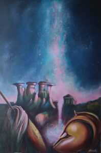 Adriano fu imperatore romano dal 117 al 138 e passò alla storia per aver consolidato le frontiere dell’impero Romano che sotto la sua guida raggiunse la massima espansione. La sua figura è legata anche all’arte e alla bellezza visto che Adriano fu un fine letterato, musicista, architetto, esteta. La sua maturità gli permette di guardare alla morte come ad un orizzonte, cosicché la vita può essere riletta con la serenità, la maturità necessaria. Sarà proprio l’estetica che ci guiderà in questa mia breve critica alla pittura di Donatello Verrastro che da domenica 5 Febbraio p. v. esporrà presso il Museo Archeologico di Muro Lucano. Vernissage dalle 17 alle 19. Perché l’estetica, come ci insegna Adriano, è il perfezionamento filosofico della bellezza e perché l’estetica ha bisogno della comprensione della morte. Richiede una catarsi del proprio io esistenziale. Un viaggio attraverso la disperazione e oltre la speranza. Con l’approdo appunto alla maturità di cui vi ho parlato. Più che iconico Donatello Verrastro è un pittore figurativo, con evocazioni simboliche e riferimenti fantastici. Egli dipinge su suggestioni, idee progettuali definite ed anche in riferimento a simbiosi artistiche con poeti e scrittori. Verrastro affresca la realtà nei suoi aspetti concreti, con la forma che gli oggetti hanno in natura, in conflitto all’arte astratta. Le figure umane, i corpi in costume, i volti, tendono quasi ossessivamente a ripetere i tratti originali o di fantasia che il pittore fissa nella mente. Il suo obiettivo è una sorta di perfezione algoritmica fra progetto e realizzazione. Per questo, oltre che per ragioni professionali, legate alla sua attività di dirigente medico, la produzione artistica non è illimitata. Si tratta di poche (una trentina), pregiatissime opere pittoriche di esemplare fattura.