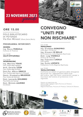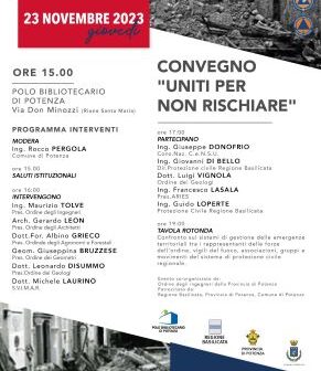Questo il tema di “Uniti per non rischiare”, in programma giovedì 23 novembre presso la sala convegni del Polo Bibliotecario di Potenza (via Don Minozzi – Rione Santa Maria): evento a cura dell’ingegnere e consigliere comunale Rocco Pergolaco-organizzato dall’Ordine degli Ingegneri della Provincia di Potenza e con il patrocinio di Regione Basilicata, Provincia e Comune di Potenza.