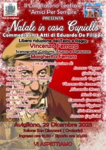 Ritorna in scena il Laboratorio Teatrale” Amici Per Sempre”, che il 29 Dicembre porterà in scena la commedia del grande ed indimenticabile Eduardo De Filippo” Natale in Casa Cupiello” con una libera Riduzione del testo e Regia a cura di Vincenzo Ferrara, mentre le scenografie, costumi, trucco e Parrucco saranno curati da Margherita Ferrara .Un casting di 10 bambini di età 5/ 13 anni cercheranno di immedesimarsi nei personaggi che il De Filippo scrisse per questa commedia del 1931 sulla scena: Luca Cupiello: Lorenzo Ungaro Concetta: Giulia Pace Tommasino ( detto Nennillo):Leonardo Ungaro Ninuccia: Vincenza De Leonardis Pasqualino: Alessandro Mecca Nicola Percuoco: Nicolò Pace Vittorio Elia: Emanuele Genovese Olga Pastorelli: Clarissa Viggiano Raffaella( la Portinaia): Siria Mancusi Il Dottore: Lorenzo Guglielmi Presenta la serata: Mariassunta Carlucci La rappresentazione teatrale si effettuerà presso il Salone San Giovanni ( Oratorio) ad Avigliano( PZ) con ingresso ore 19:30, Sipario ore 20:00 L’ evento è inserito nel cartellone Natalizio del Comune di Avigliano. Mentre il 5 Gennaio 2024 replica a Ruoti presso il Centro Polivalente con ingresso ore 19:30/sipario ore 20, Il laboratorio Teatrale Amici Per Sempre è attivo sul territorio Aviglianese dal 1999 e dal 1999 il responsabile di questo Laboratorio ( società civile organizzata no profit) Vincenzo Ferrara, attore e regista ha fatto conoscere la cultura e la bellezza del Teatro a tanti bambini ragazzi, giovani e Adulti portando sulla scena commedie che spaziano dal teatro di Eduardo, alle commedie di Shakespeare, Goldoni, ma anche a numerose commedie in Vernacolo per fare conoscere la tradizione ai più piccoli attraverso la recitazione ,il canto e il ballo, molti i musical portati anche in scena tra cui Grease, Mamma Mia,Mary Poppins,Dirty dancing . Nel 2001 il laboratorio ha partecipato ad un concorso di giovani compagnie a Napoli con la commedia” Napoli Milionaria” vincendo il primo posto. Ad affiancare in ogni spettacolo Vincenzo ,per le scenografie, costumi, trucco e parrucco la preparatissima Margherita Ferrara. Il laboratorio riprenderà le iscrizioni ai corsi gratuiti per bambini / ragazzi e Adulti tutti i Giovedì a partire dall’ 11 Gennaio con orari 18:00/20:00 presso la Sala Consiliare del Comune di Avigliano Con la preparazione di nuovi progetti per l’ anno 2024.