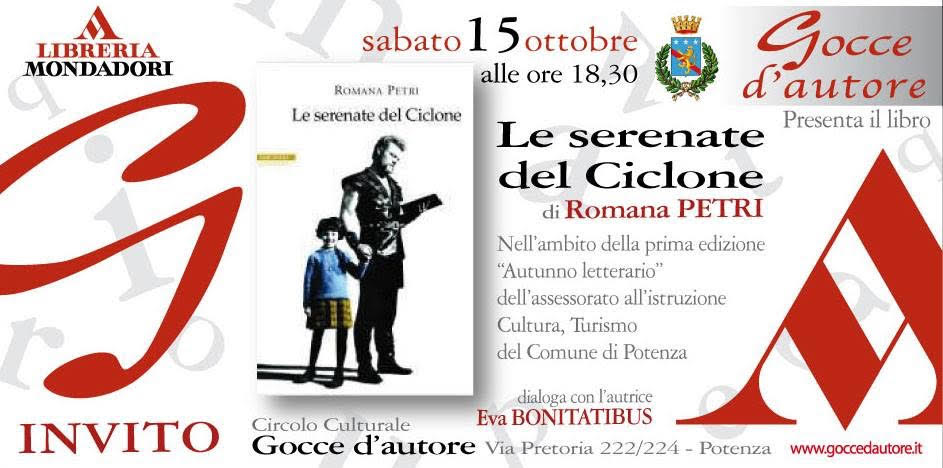 Non dimenticate però la proposta di Gocce d’Autore , in vico De Rosa per la prima edizione dell’Autunno Letterario in centro : alle h 18,30 del 15 ottobre ci sarà la presentazione del libro di Romana Petri , ” Le serenate del Ciclone ” , dialogherà con l’autrice Eva Bonitatibus .