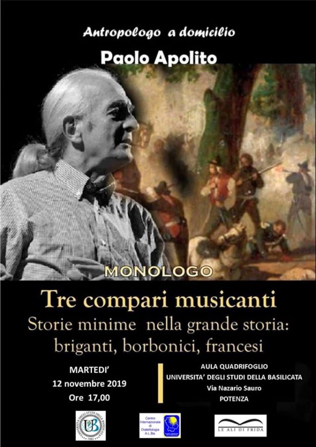Martedì 12 novembre, nell’aula Quadrifoglio del polo universitario di Via Nazario Sauro a Potenza si è tenuto uno spettacolo monologo del professor Paolo Apolito, già docente di Antropologia All’università Roma III e Salerno, intitolato Tre compari musicanti-storie minime nella grande storia: briganti, borbonici, francesi. L’evento è stato organizzato dal Centro Internazionale di Dialettologia (C.I.D.), in colaborazione con l’associazione “Le Ali di Frida”.