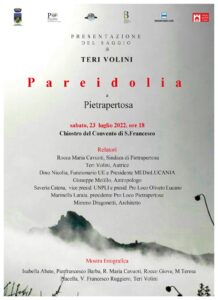 Cos’è la pareidolia lo spiego nel saggio omonimo che verrà presentato il 23 luglio a Pietrapertosa, partendo da quella prerogativa (non in tutti presente) di scorgere figurazioni d’ogni tipo (visi umani o animali, profili fantastici e quant’altro) in oggetti, nuvole, elementi naturali e persino urbani.