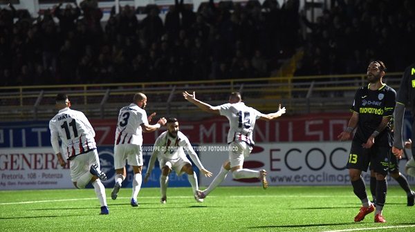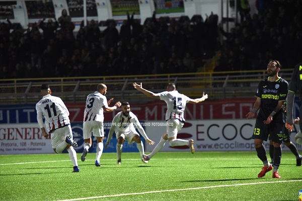 è arrivato sulla testa di Franca, ben appostato sul secondo palo, che ha messo nella rete sguarnita. Memore di quanto successo a Bisceglie, la squadra di Raffaele non si sono accontentati di gestire il vantaggio ma hanno insistito alla ricerca del secondo gol. E ci sono andati molto vicini, in rapida successione, prima con un tiro di Guaita deviato in angolo dal portiere pugliese, poi con Piccinni che ha sfiorato la traversa, poi con un’altra manovra ben congegnata e conclusa da Guaita con un tiro violento parato in angolo dal portiere avversario. Per la Virtus Francavilla che assisteva passiva allo show del Potenza solo un tiro da oltre trenta metri di Sarao e una punizione di Lugo Martinez parati in grande sicurezza da Ioime. Il raddoppio è arrivato a 6 minuti dalla fine della prima frazione di gioco. Su un calcio d’angolo di Dettori la palla è arrivata sui piedi del rientrante Sales che rasoterra ha superato l’esordiente estremo difensore Nordi. E sul doppio vantaggio, frutto del dominio assoluto del Potenza, si chiude il primo tempo. Nella ripresa non cambia la falsariga della partita perché il Potenza decide saggiamente che non è il caso solo di gestire il vantaggio e continua ad essere sempre propositivo. Con ciò ottene