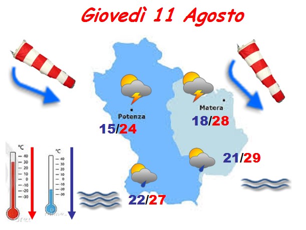 Giovedì 11 Agosto avremo un rapido peggioramento con un aumento della nuvolosità, soprattutto nelle zone interne, e precipitazioni sparse sotto forma di piovaschi che occasionalmente potranno presentarsi anche a carattere temporalesco.