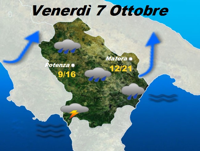 Venerdì 07 ottobre: condizioni di tempo perturbato con precipitazioni intense ed estese che localmente potranno assumere, sui settori tirrenici, carattere temporalesco anche di forte intensità Venti moderati da Libeccio e mari molto mosso il tirreno, poco mosso lo Ionio. Temperature in aumento le minime senza notevoli variazioni le massime.