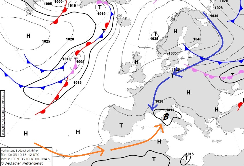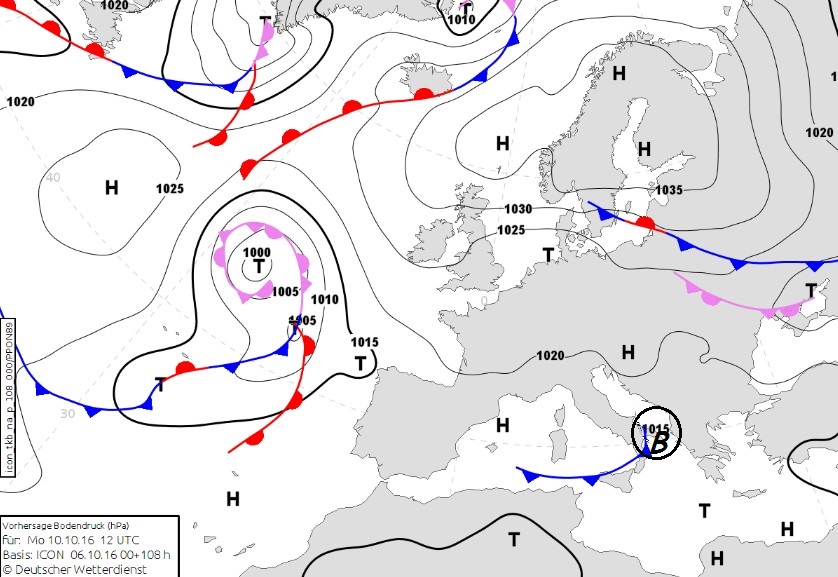 un nuovo minimo depressionario si andrà formando per Domenica tra la Corsica e l’alto Tirreno, minimo che nelle ore centrali di Lunedì ritroveremo sulla Puglia poco più a sud del Gargano (Fig2.).