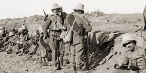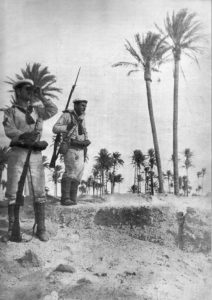 Sulla strada che da Sciara-Sciat porta alle nostre postazioni di trincee e truppe, il maggiore Vincenzo Bianculli di Moliterno presenta ai soldati, lì dislocati, gli ufficiali del suo battaglione. Con l’intero reggimento di cavalleria “Lancieri di Firenze” è anche partito per il fronte africano l’ufficiale Giacomo Lacava, figlio dell’on. Pietro Lacava di Corleto Perticara.