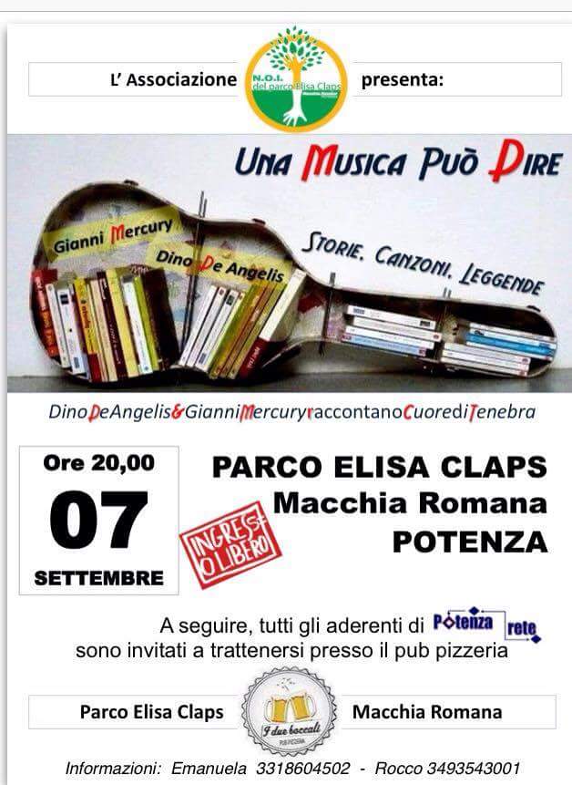 “Se vuoi l’arcobaleno devi sopportare la pioggia” … e N.O.I. (Nucleo Organizziamo Insieme ) DEL PARCO ELISA CLAPS, cittadini Potentini e non, residenti nel quartiere di Macchia Romana, da tempo ormai noto abbiamo necessità, come gli altri abitanti della città, di esternare disagi, insofferenza e delusioni, scaturiti da incuria e scarsissima manutenzione in numerose zone del rione. Particolarmente allarmati da ciò, dapprima si costituisce l’associazione che formalizza un gruppo già ben compatto di persone con le idee chiare ed obiettivi precisi. Poi consapevoli del fatto che i tentativi svariati di altri grandi sognatori, in passato non hanno reso concrete che poche cose, si ingegnano vestendo i loro entusiasmi e la gran volontà di senso civico, tutela del verde e degli animali, di arte, musica e sport, riscoprendo la capacità di INVENTARSI EVENTI DI SUCCESSO, dando merito alla gran partecipazione di presenti di ogni età e realtà. E’ visibile a tutti la carrellata di appuntamenti svolti in passato dal 12 marzo 2016, piovosissimo giorno d’inizio, sulla pagina del social Facebook , ed altri piovosi incontri costruttivi e fortunati si sono susseguiti. Il nucleo fortificato da maggiori presenze attive, lavora già da giorni per il prossimo evento del 7 settembre. Imminente ed atteso. Una prova del nove. Perché ora è a tutti ben chiaro che aumentare interesse, creando eventi di piacevole successo, sarà utile per innalzare qualità e costanza tra gli aspetti del trascurato rione. Dovremmo elencare nomi e buone intenzioni dei vari organizzatori di eventi e risoluzioni, ma descrivere l’evento che verrà sarà il compito dei più attenti ed informati sostenitori del gruppo NOI DEL PARCO ELISA CLAPS . Accogliere due artisti per ogni forma e talento , é già per NOI un grande onore. Migliore biglietto da visita non potevamo augurare . E come si fa nelle seguitissime pubblicità : “NOI proponiamo, insieme elaboriamo, ed un buon prodotto offriamo ” … un DUO STUPEFACENTE CHE SARÀ IL NOSTRO ORGOGLIO … con ” UNA MUSICA PUÒ DIRE ” non si può che progredire !