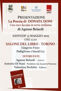 La poesia di Donata Doni presentata al salone del libro di Torino il 15 di maggio 2025 con il patrocinio del Consiglio regionale della Basilicata, Pierluigi Maulella relatore, Antonio Di Stasi presidente dei Lucani in Piemonte, Valentina Porfidio editore e l’autrice Agnese Belardi. La kermesse del libro a Torino ha scelto come tema 2025″ le parole tra noi leggere” e, proprio nella poesia di Donata Doni scrive Agnese Belardi, stanno i significati possibili: leggere/ leggère, riferite all’importanza della lettura e alla leggerezza delle parole che abbattono l’incomunicabilità e le liriche leniscono il dolore. Sono un dono di libertà di espressione ,spontaneità e creatività. Leggerezza dei termini come delicatezza e a quanto riferisce l’autrice che con tenacia, impegno e caparbietà ha riportato in quindici anni di studi, in luce la poetessa Donata Doni , la quale ha scritto centinaia di testi poetici e nei versi ha espresso, sensibilità d’animo e di cuore . Leggerezza come gioia felicità e ottimismo ,le parole delle liriche danzano nel vento come la libertà e la gioia e toccano il cuore delicatamente. Belardi afferma, la poesia è un’arte soggettiva e parafrasando Italo Calvino a proposito della leggerezza, evidenzia la capacità del poetare di trattare temi complessi in modo chiaro elegante e senza peso nella poesia . La leggerezza è una qualità letteraria che consente di affrontare temi profondi con una scrittura agile precisa e suggestiva. La poetessa Donata Doni lo ha fatto a suo tempo ed ecco che viene riportata in luce_e finalmente non può essere dimenticata riferisce Antonio Di Stasi _ che rimarca, il lavoro dell’associazione salotto Doni di Lagonegro (a lei dedicato )che attraverso la divulgazione dei suoi scritti stimolano al dialogo al confronto tra le persone e divulgando le sue poesie servirà per educare ai sentimenti e debellare la violenza in ogni forma. Valentina Porfidio editore conclude di aver voluto editare il libro per l’alto valore culturale e riferisce: _Vi è una riscoperta della bellezza e le tradizioni di un paese Lagonegro ma anche dell’ intera regione la Basilicata con i saluti di Pierluigi Maulella ha rappresentato le istituzioni ,ha espresso apprezzamento per questa voce Lucana che comincia ad avere una voce fino alla Romagna_un plauso all’ autrice che attraverso il salotto Doni fa conoscere il patrimonio culturale e ambientale dei luoghi e stimolare i giovani a conservare le radici e spronare gli abitanti ad apprezzare dove si vive valorizzando la lingua madre le tradizioni. Attraverso il libro la poesia di Donata Doni un ringraziamento al lavoro di don Gianluca Bellusci parroco e il prof. Francesco Costanza che hanno curato la presentazione e l’ introduzione del testo, sottolineando la religiosità della Doni e la liricità. Un omaggio alla storia delle due regioni che tutti dovrebbero leggere pe fare comunità.