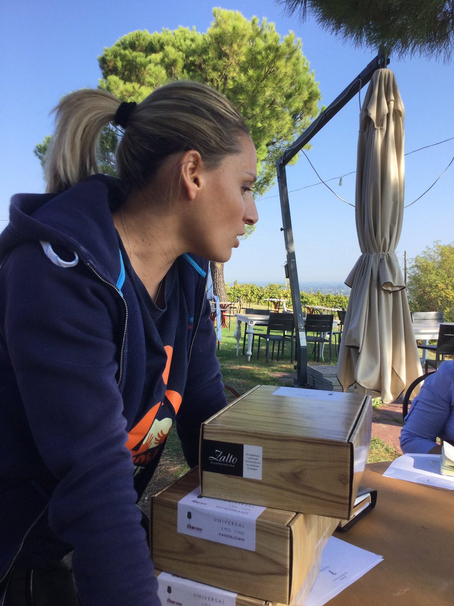 Lucia Ziniti, insieme al suo compagno, gestisce le produzioni della Cantina San Biagio Vecchio, e i vigneti cui essa fa capo. Si produce ottimo vino in bottiglia che viene esportato in tutto il mondo. E’ una cantina piccola, ma non è questo che la rende speciale, quanto il lungo lavoro di recupero di vitigni autoctoni della zona. Lucia ci racconta del Centesimino, una varietà di vino (e relativa vite) che sembrava scomparso fino a quando Pietro Pianoro (soprannominato Centesimino per la sua proverbiale avarizia) non prese le marze di una vite che stava nel giardino di casa sua, a Faenza, e le trapiantò a Terbate, vicino ad Oriolo. Segue una complicatissima saga familiare, di eredità affitti e vendite di vigneti, di affidamenti alla parrocchia e ad un sacerdote esperto vignaiuolo; non riesco a starci dietro, mi accontento di sapere che ora è quasi tutto nelle belle mani di Lucia e il Centesimino si produce ancora, insieme al Sabbiagialla (chiamato così per onorare le vene sabbiose che affiorano in superficie nei vigneti, insieme all’argilla e all’argilla rossa, e ai fossili di conchiglie, segni evidenti che qui una volta era tutto sotto il mare) di uve Albana, al Sangiovese immancabile. Forse sono state proprio le degustazioni ad alleggerirmi la testa e ad impedirmi di seguire lucidamente la storia delle proprietà terriere; per fortuna il proprietario di un ristorante, che divide con la Cantina San Biagio Vecchio il piazzale e i tavolini con vista sul paradiso ai quali siamo sedute, ci ha preparato “uno spuntino” sul quale appoggiare il gran vino che Lucia continua a mescerci.